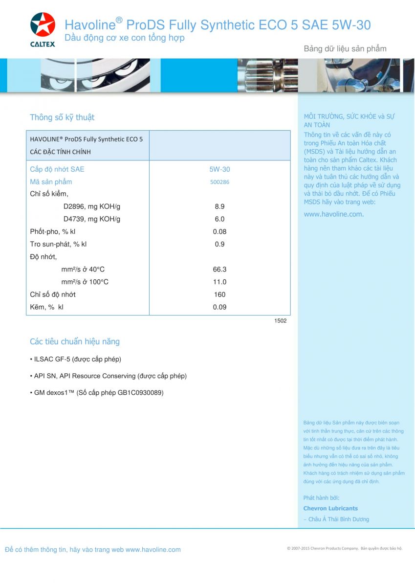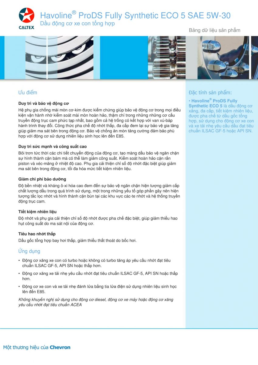 Havoline® ProDS Fully Synthetic ECO 5 SAE 5W-30 là một loại dầu nhờn động cơ xăng giúp bảo tồn nhiên liệu, đa cấp được pha chế với các loại dầu gốc tổng hợp cho việc sử dụng ở các động cơ xe con và xe tải hạng nhẹ yêu cầu độ nhớt thấp, ILSAC GF-5 hoặc API SN.