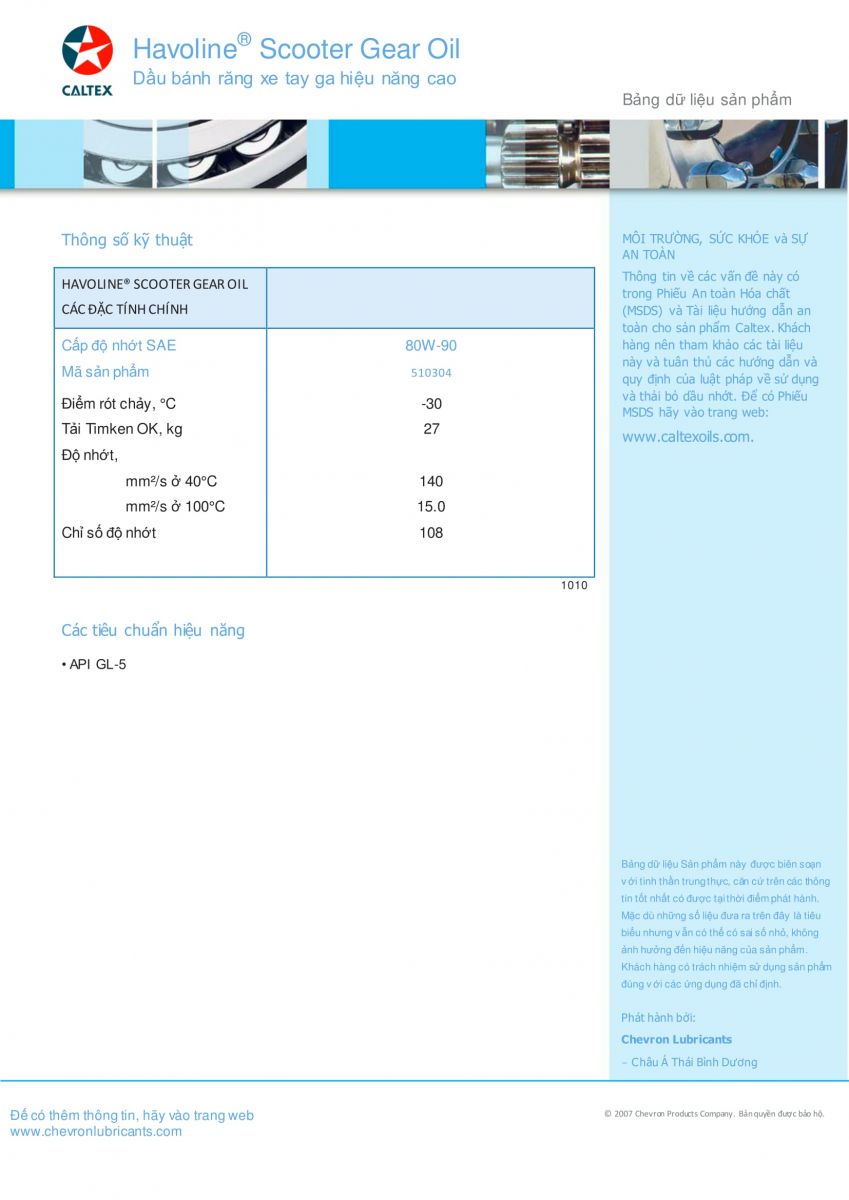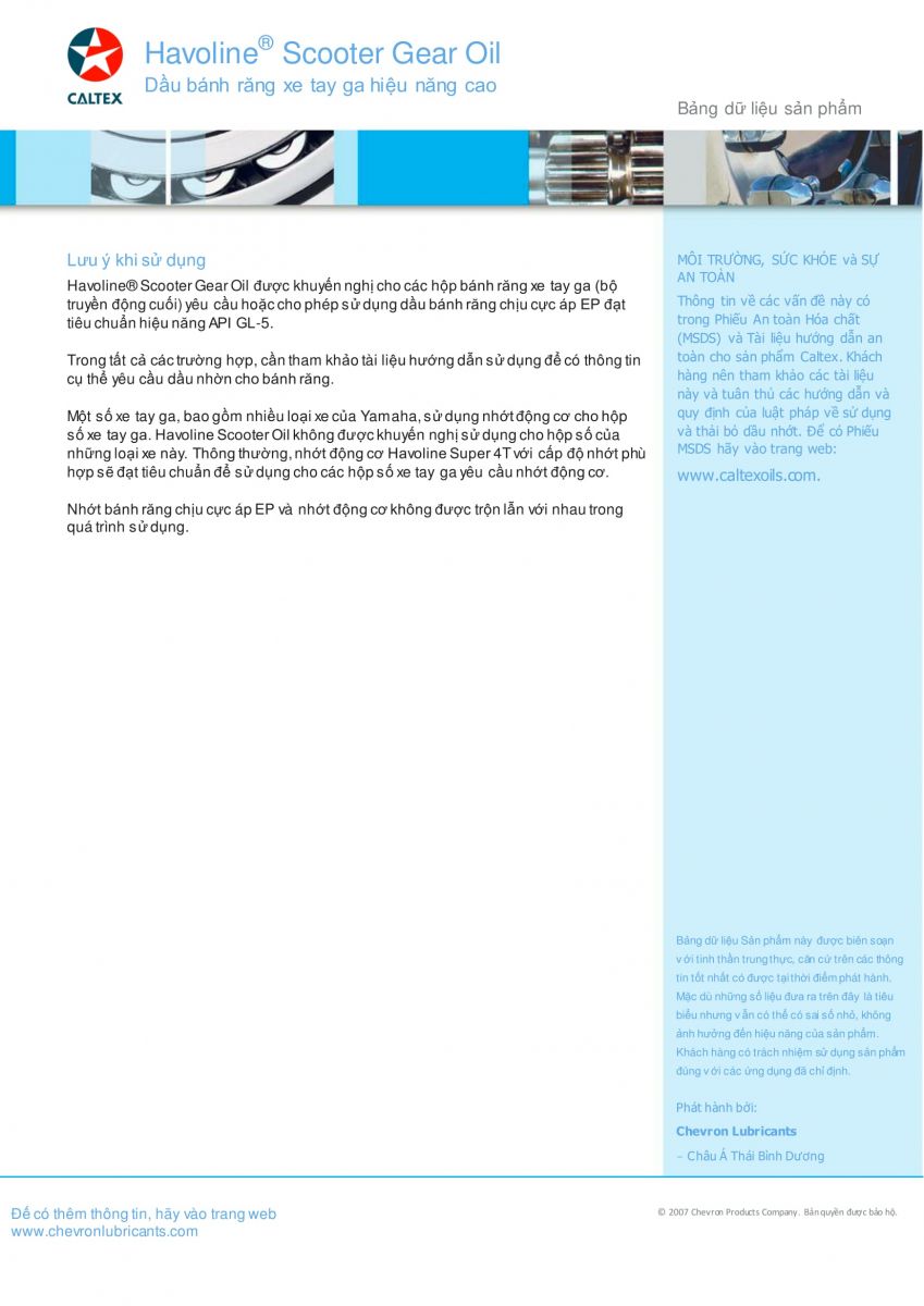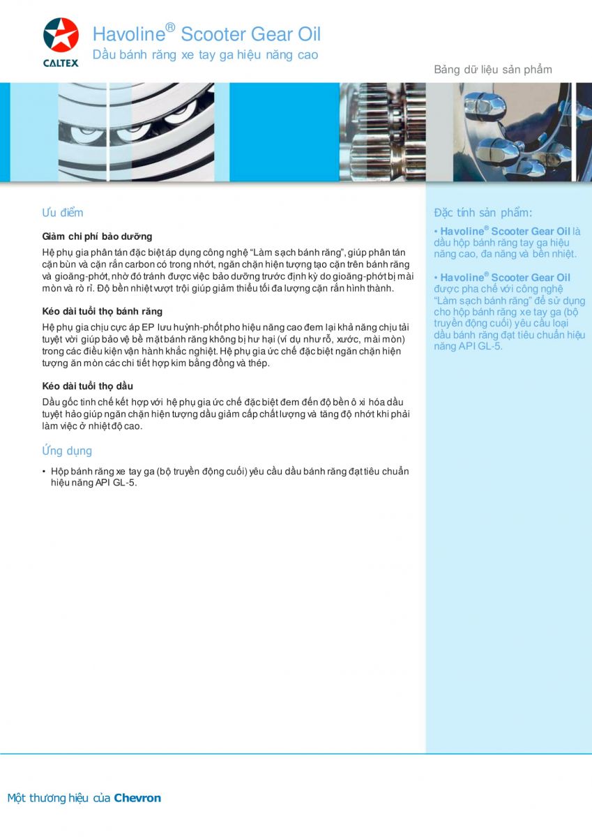 Havoline® Scooter Gear Oil là loại dầu hộp số xe ga hiệu suất cao, đa chức năng, bền về nhiệt Havoline® Scooter Gear Oil được pha chế với công nghệ “bánh răng sạch” để sử dụng trong các hộp số xe ga (các bộ truyền chuyển động cuối) nơi mà dầu hộp số cực áp cấp API GL-5 được khuyến cáo.